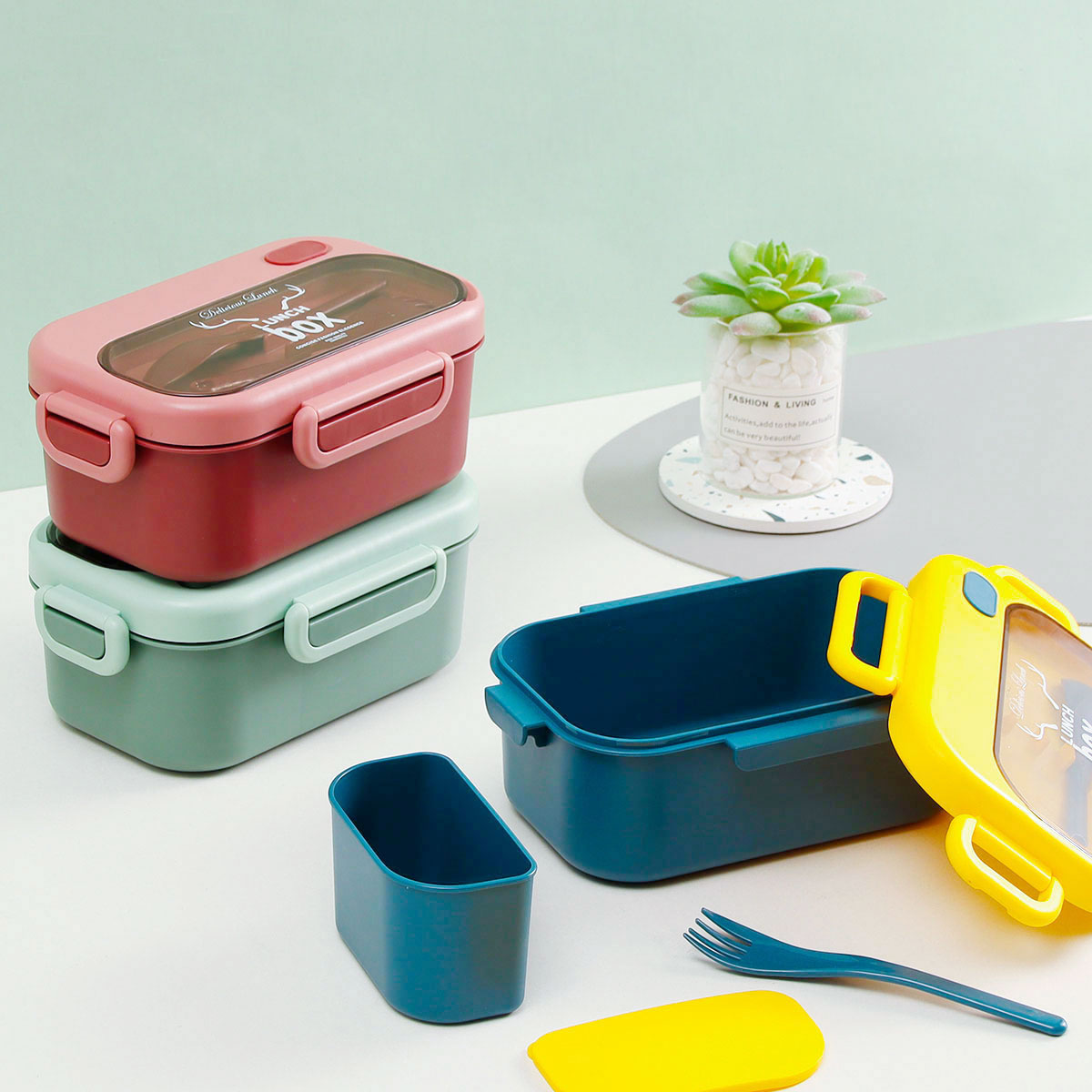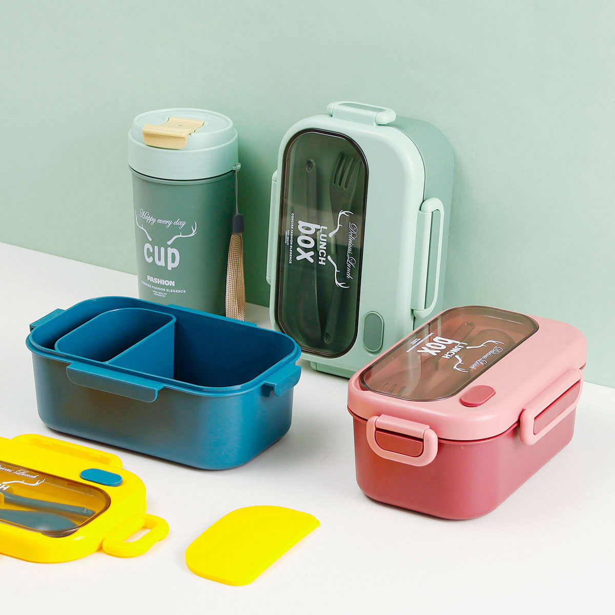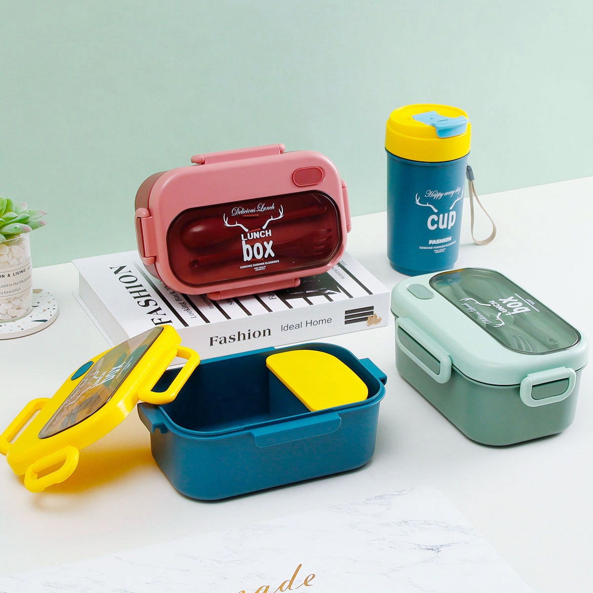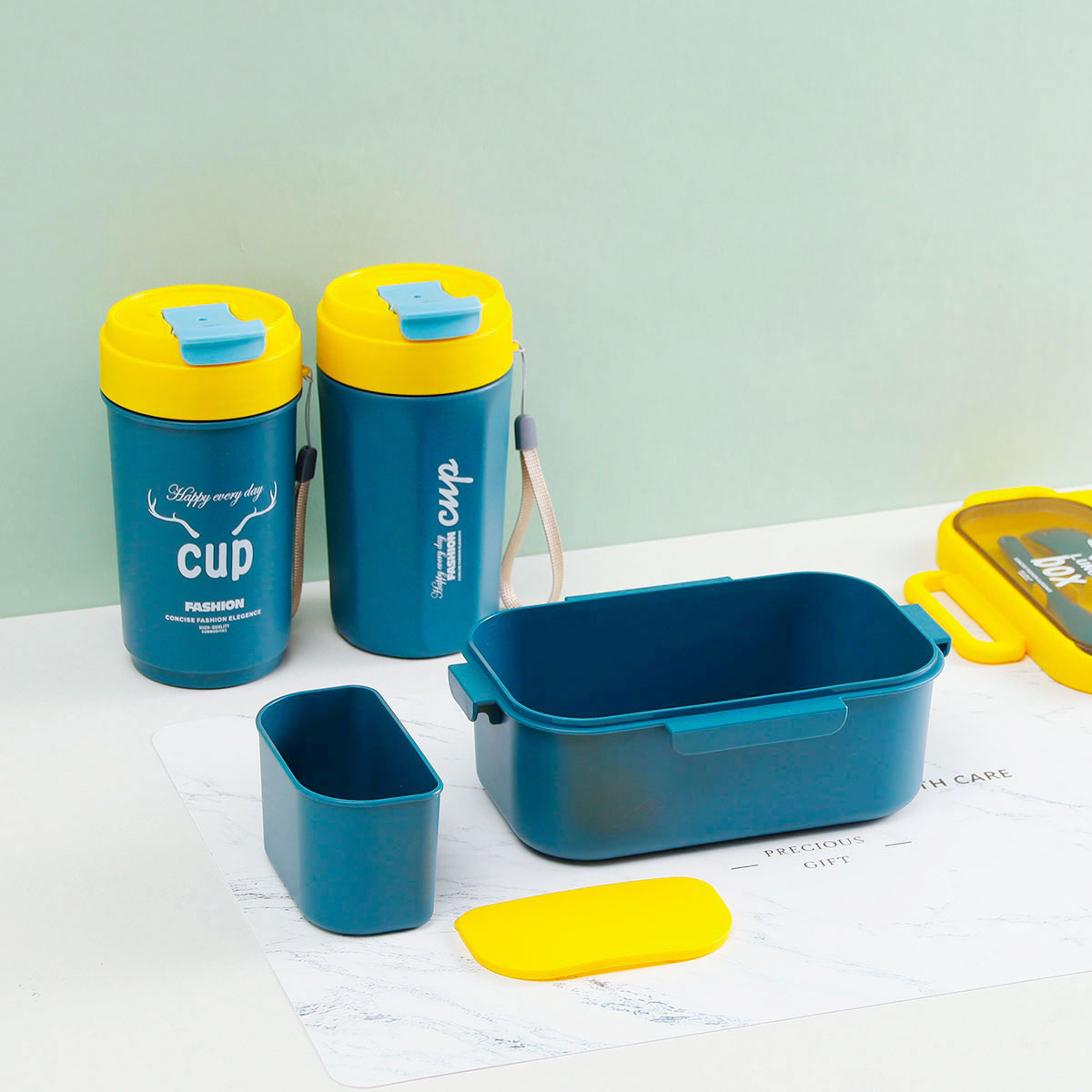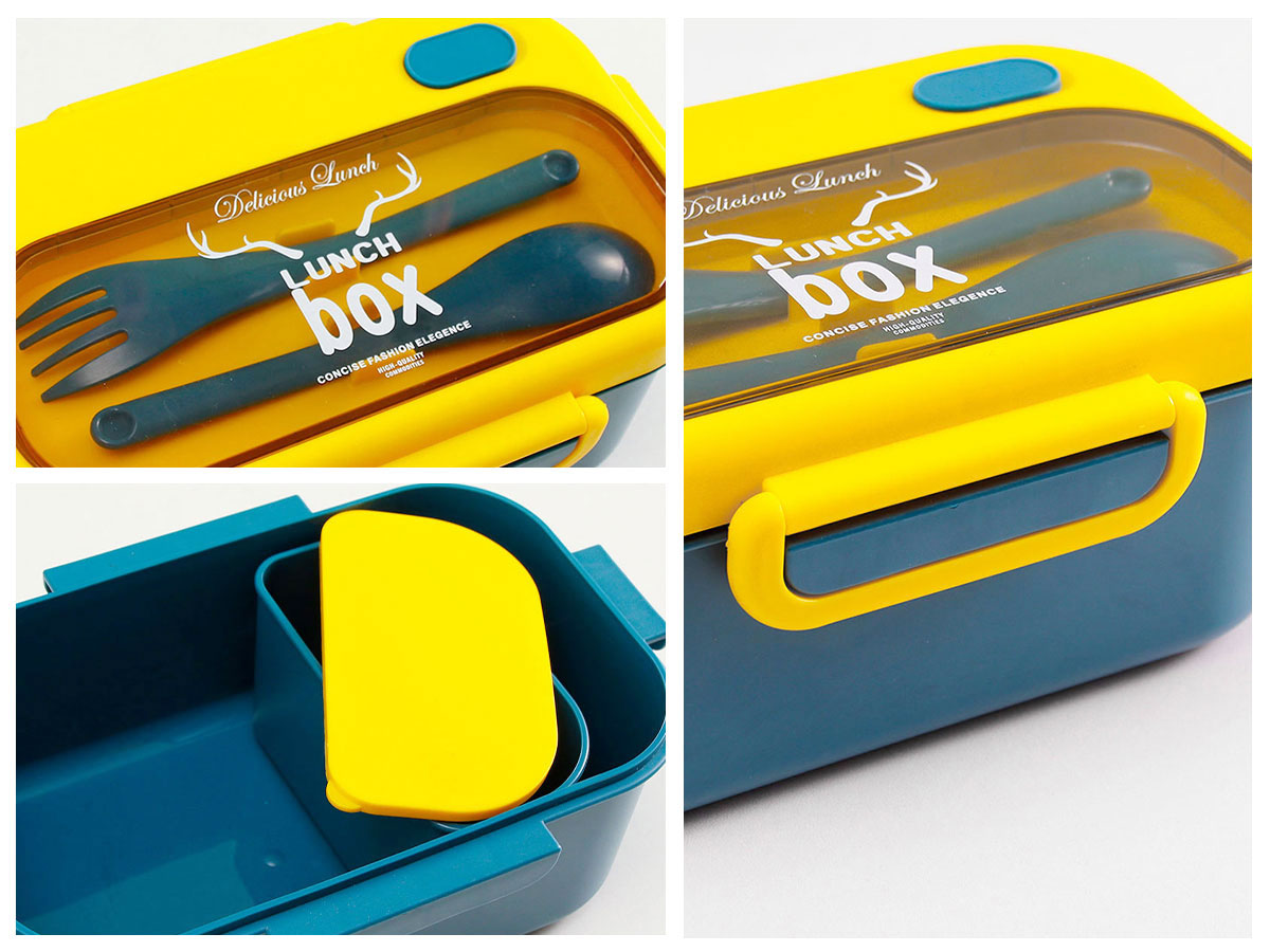 品悅長方單層密封飯盒(1000ml)(含格子)+圓形/八角隨行杯(500ml)