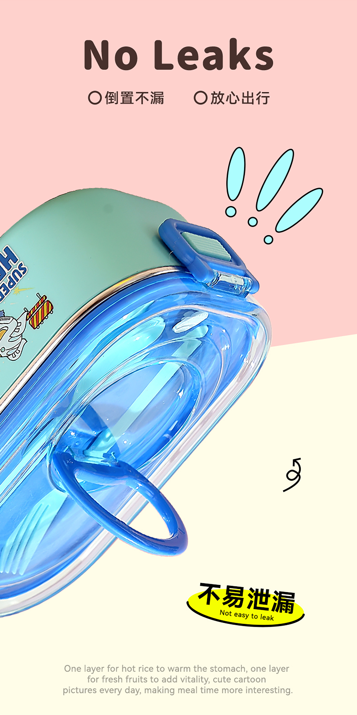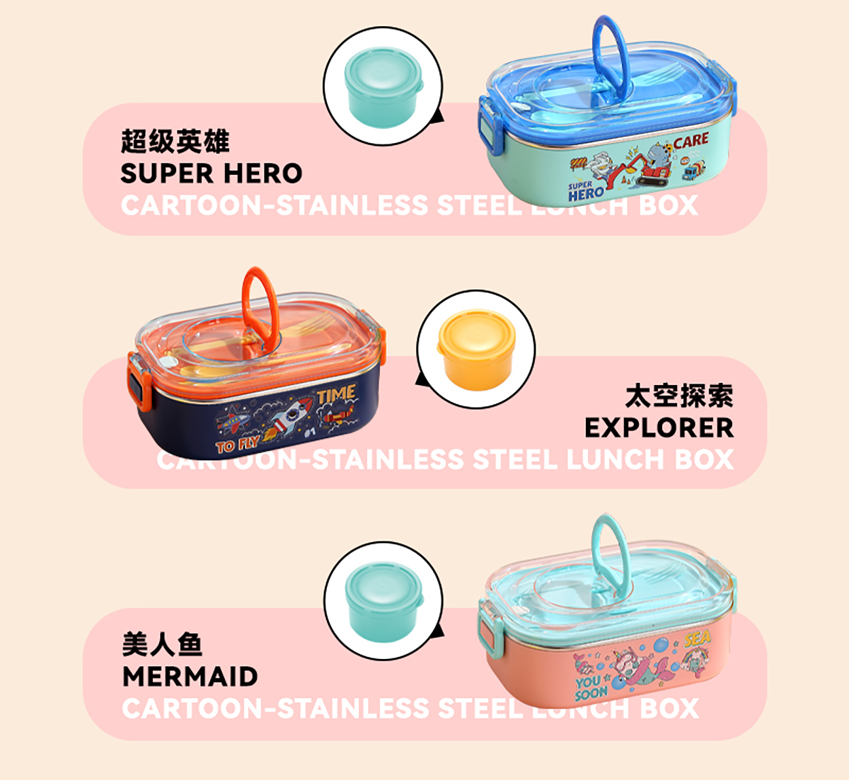 卡通手提密封不銹鋼餐盒(單格900ml/2格850ml+PP碗ml/2格850ml+不銹鋼碗150ml)