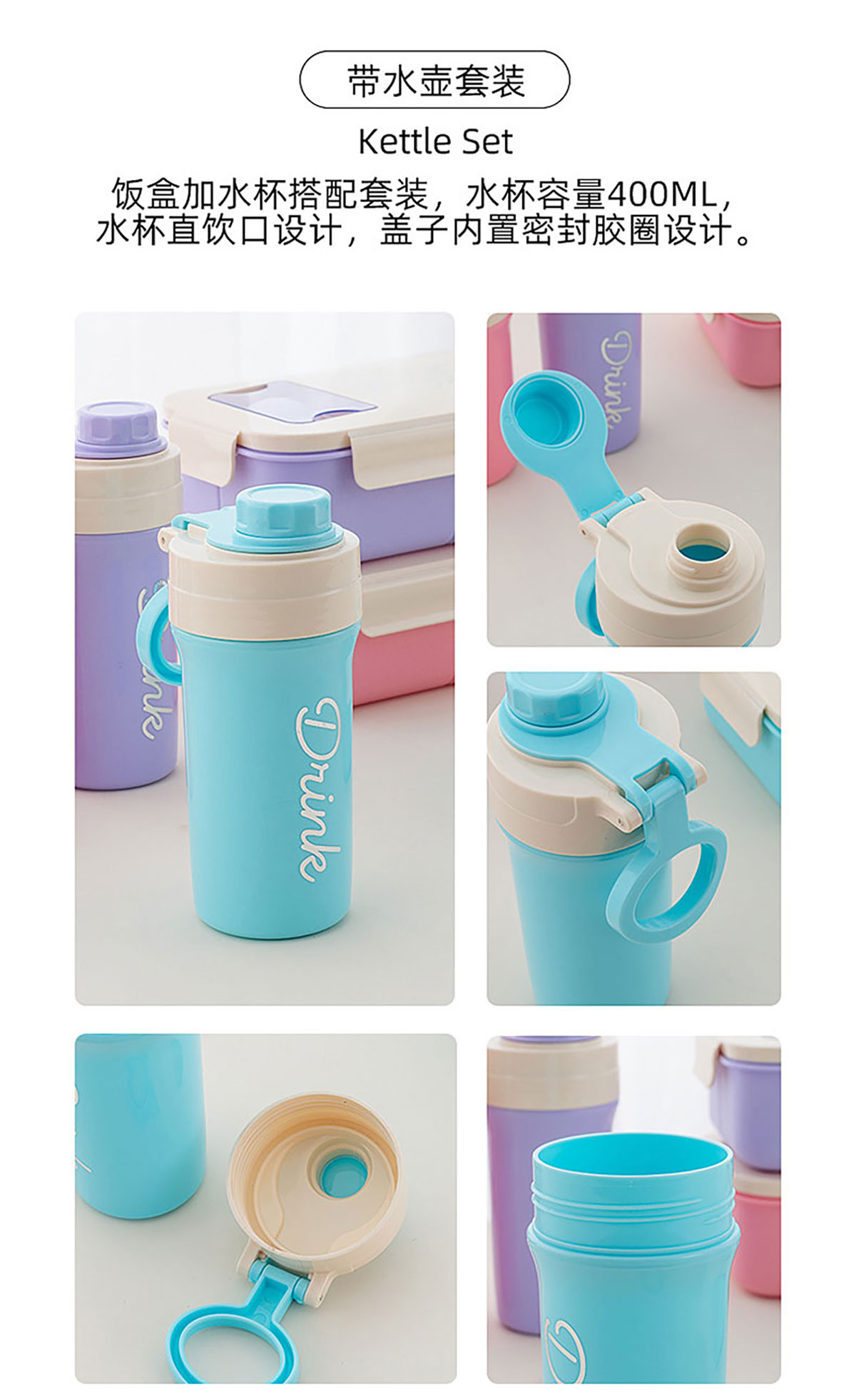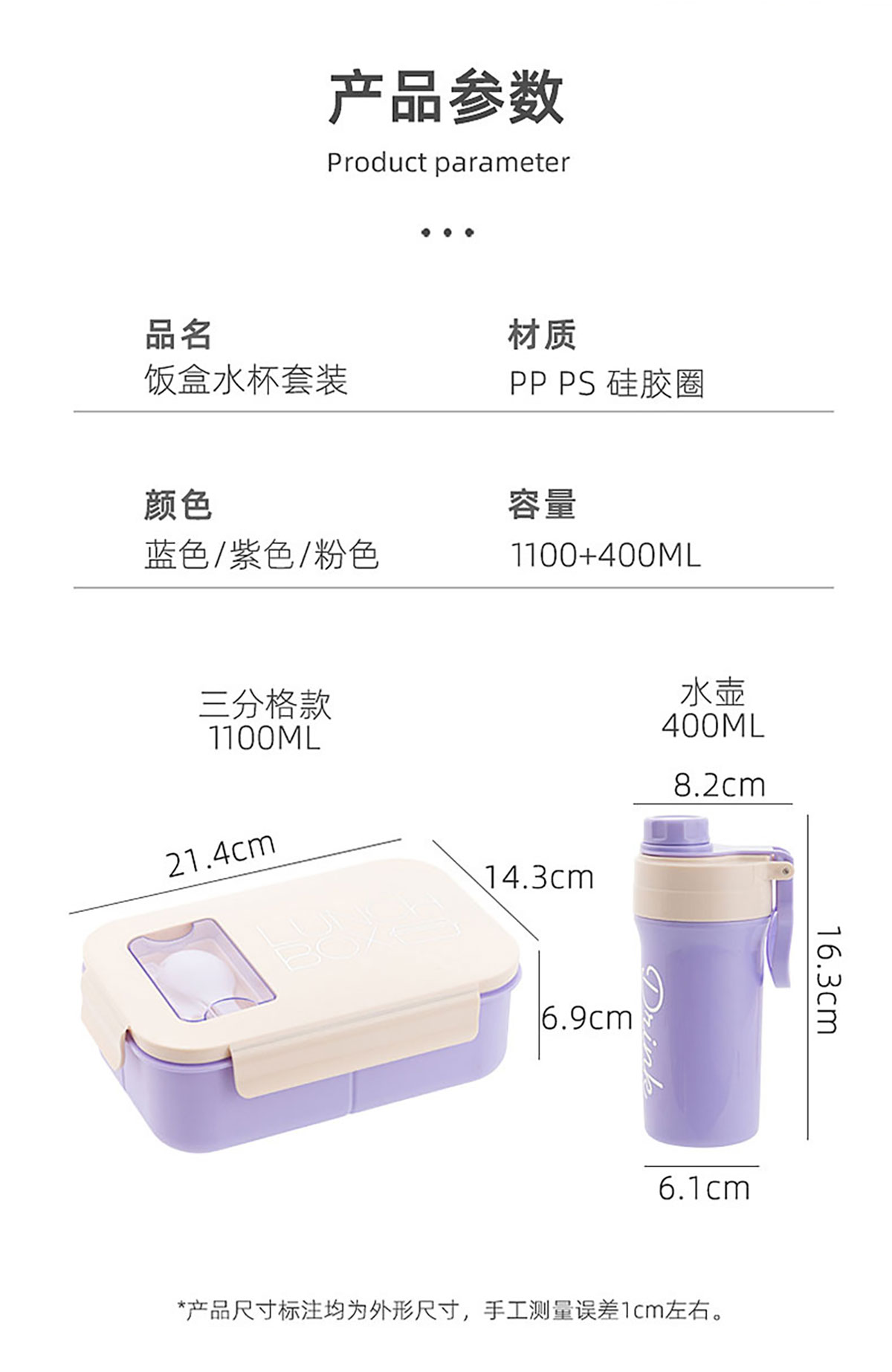Size: 飯盒:205*135*80mm/1100ml 水壺:φ70*175mm/400ml